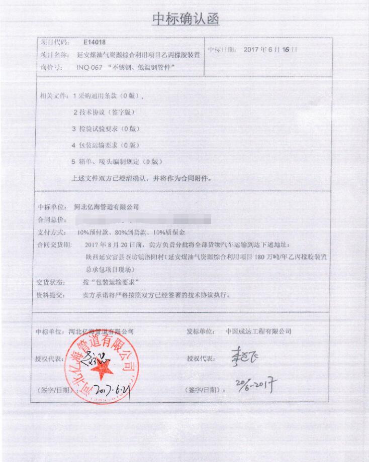 Our company has successfully won the bid for the ethylene propylene rubber plant stainless steel and low temperature steel pipe parts of yanneng chemical project of Chengda Institute